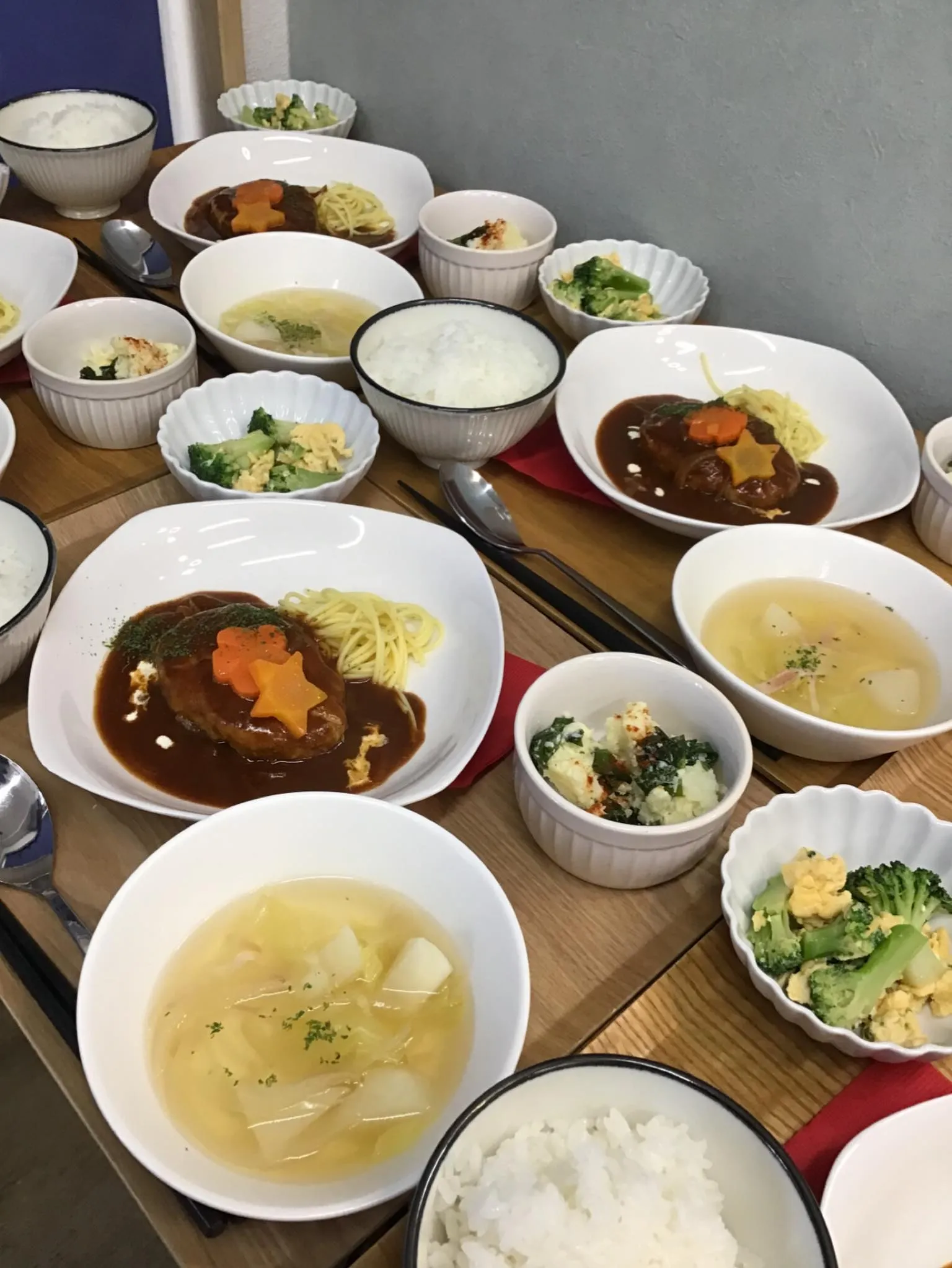 【今日のランチはこちら】 #貴船 #デイサービス #ランチ #ランチタイム #fukuoka #福岡 #北九州 #小倉北区 #カフェ #福岡グルメ #福岡ごはん #福岡ランチ #750円 #ハンバーグ デミグラスソース #ブロッコリーと卵の炒め物 #じゃがいもとわかめのマヨ和 #ご飯 #カブとキャベツのスープ