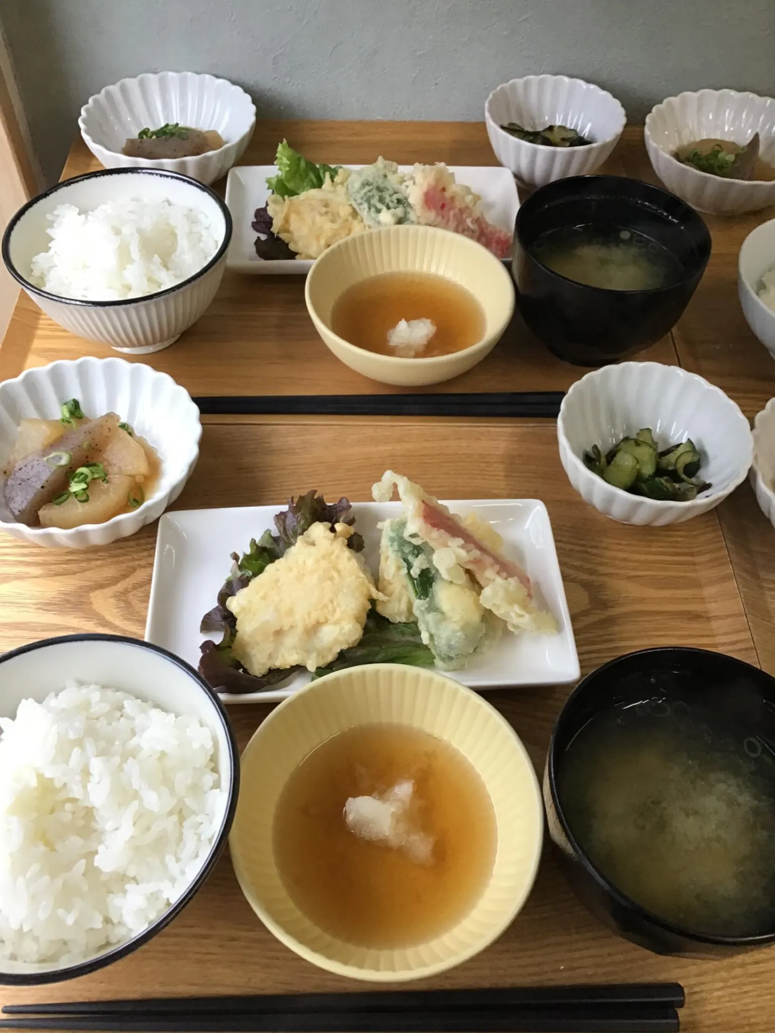 【今日のランチはこちら】 #貴船 #デイサービス #ランチ #ランチタイム #fukuoka #福岡 #北九州 #小倉北区 #カフェ #福岡グルメ #福岡ごはん #福岡ランチ #750円 #天ぷら(白身魚、ピーマン、カニカマ)大根旨煮 #きゅうりの塩昆布和え #ごはん #みそ汁