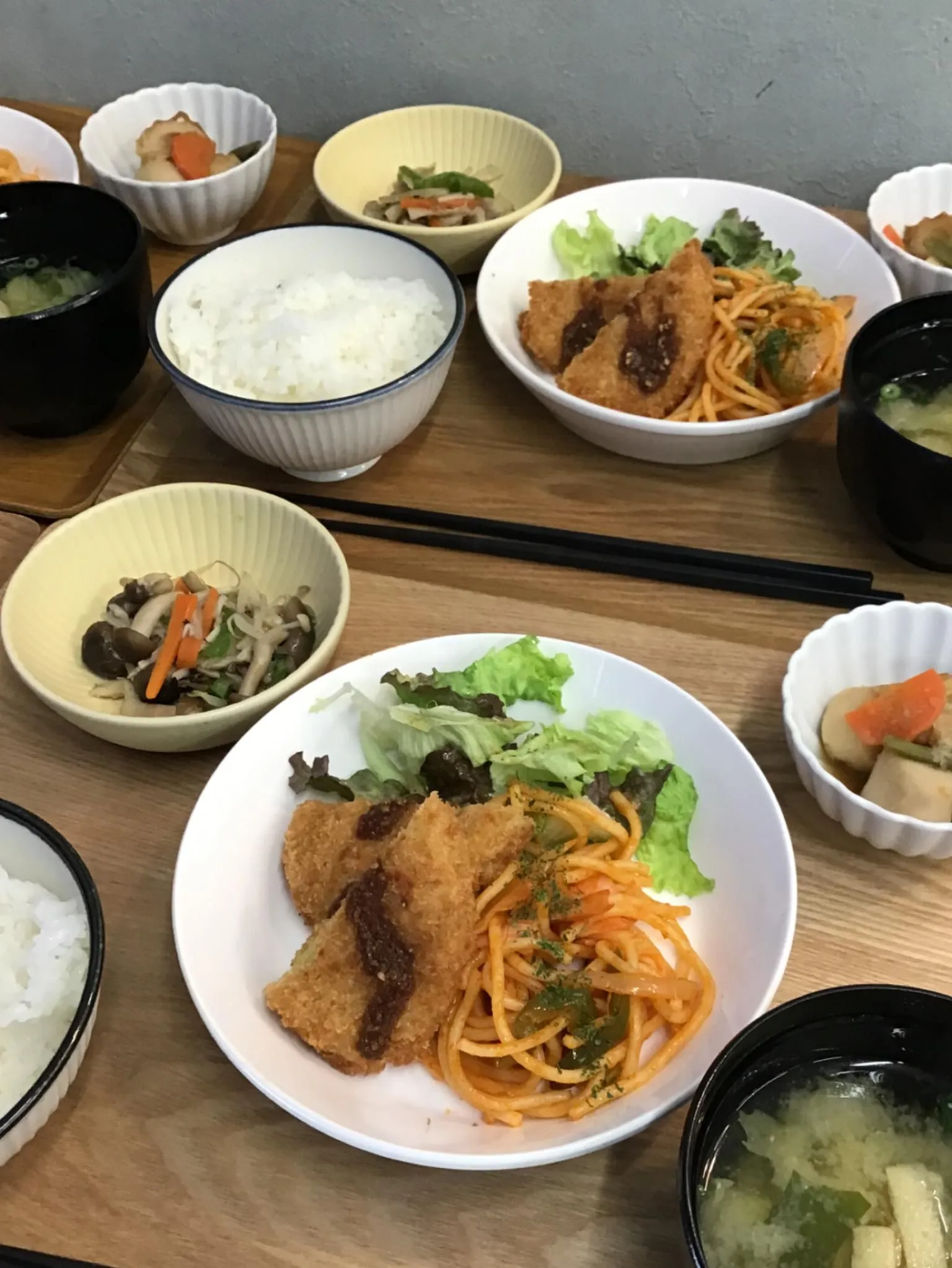 【今日のランチはこちら】 #貴船 #デイサービス #ランチ #ランチタイム #fukuoka #福岡 #北九州 #小倉北区 #カフェ #福岡グルメ #福岡ごはん #福岡ランチ #750円 # カレーコロッケ ナポリタン添え #きのこのガーリック炒め #里芋煮付け #ごはん #みそ汁
